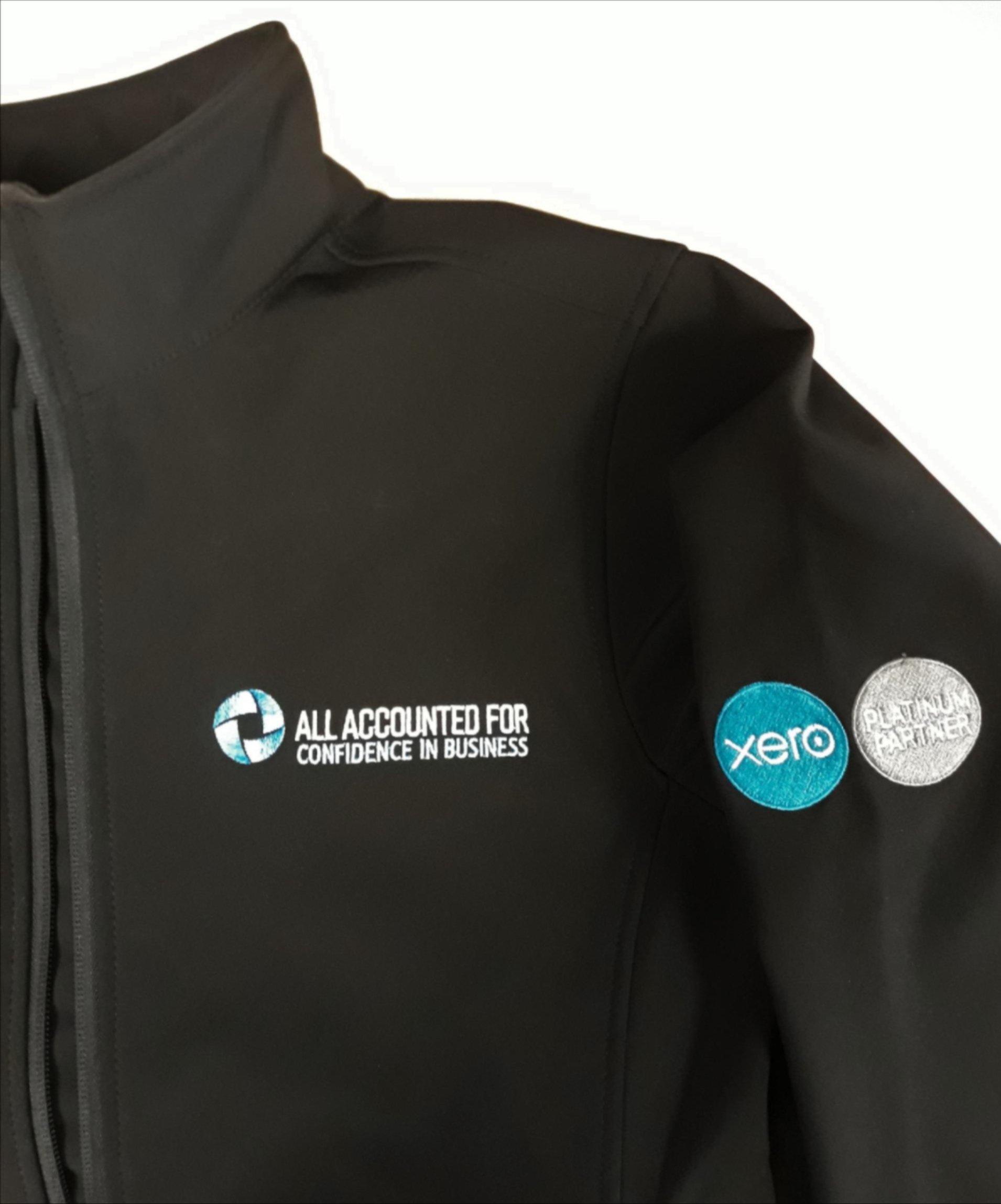 One of our smart AAF softshell jackets sourced by EmbroidMe, along with logos on chest and sleeves stitched by EmbroidMe.
